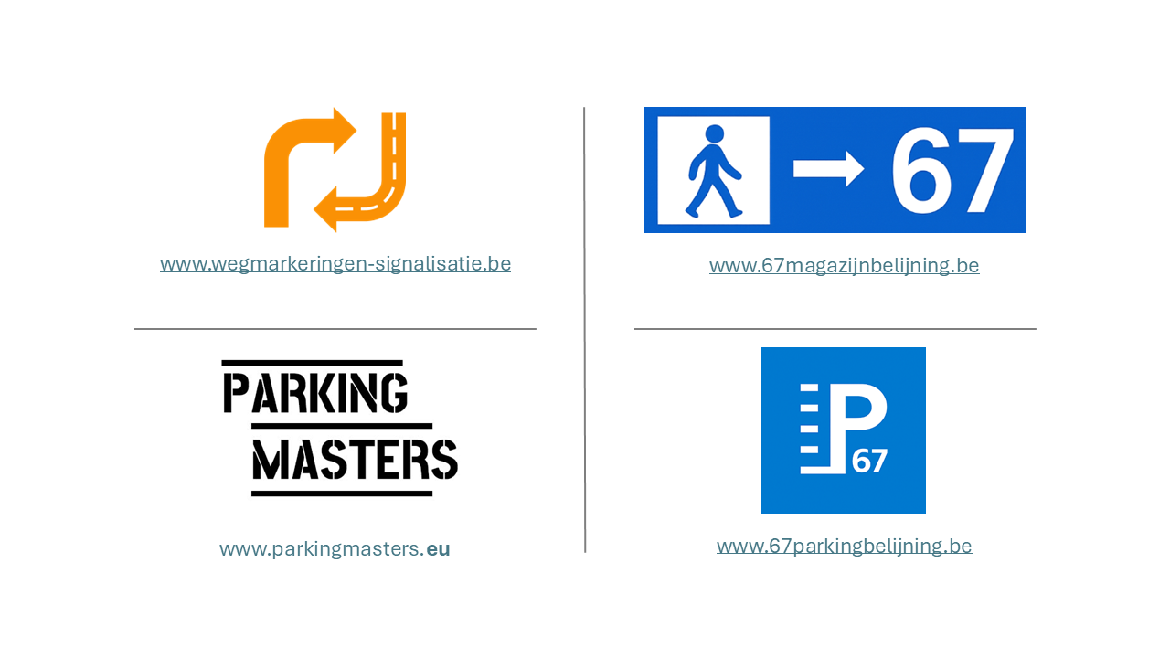 Of het nu gaat om publieke wegen, bedrijfsparkings of magazijnen, onze merken binnen 67Companies bieden elk hun eigen specialiteit in wegmarkeringen en signalisatie.